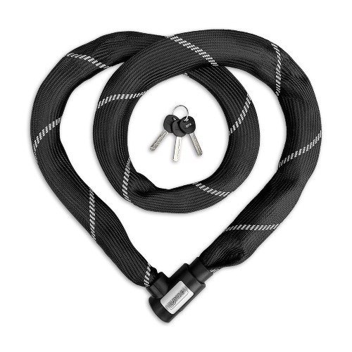 De kettingschakels hebben een dikte van 8,3 millimeter en zijn vervaardigd uit gehard staal, wat ze extra bestand maakt tegen doorzagen of doorknippen. Om het fietsframe te beschermen tegen krassen, zijn de schakels omhuld met een flexibele mesh hoes. Deze hoes voorkomt niet alleen beschadigingen, maar geeft het slot ook een moderne uitstraling.